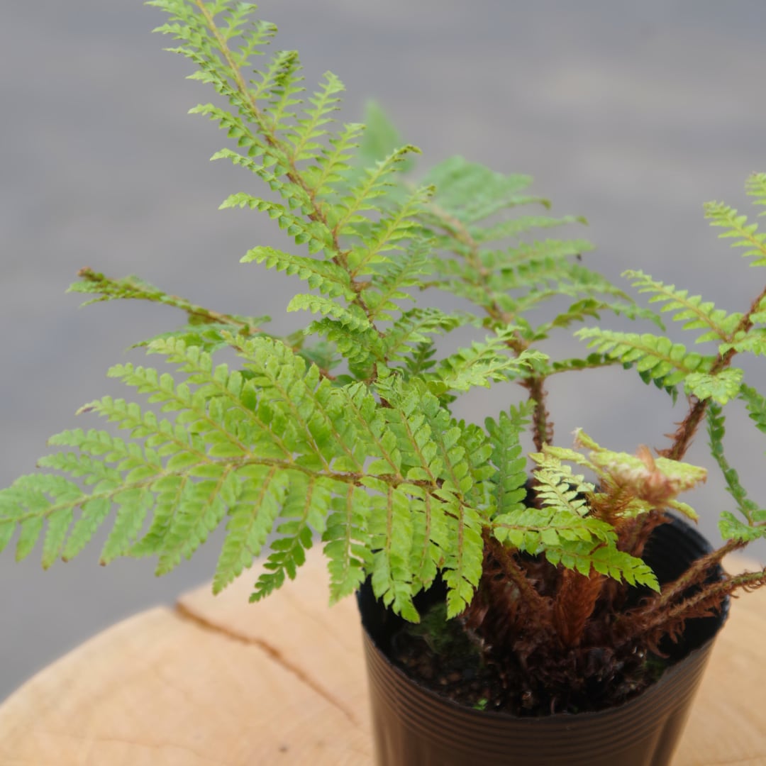 イノデは、日本の山林に自生する常緑シダ。春になると、新芽がくるりと渦を巻くように立ち上がり、その姿はまるで森が息吹を吹き返す瞬間を切り取ったかのようです。